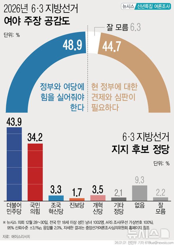 또 지방선거에서 어느 정당 후보에게 투표할 것인가에 대한 조사에서는 민주당 후보에 투표하겠다는 응답이 43.9%, 국민의힘 후보에 투표하겠다는 응답이 34.2%였다. 다음으로는 개혁신당 3.5%, 조국혁신당 3.3%, 진보당 1.7% 순이었다.