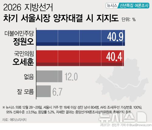 올해 6월3일 실시되는 차기 서울시장 선거 가상 양자 대결 조사에서 더불어민주당 정원오 성동구청장과 국민의힘 오세훈 서울시장이 접전이라는 여론조사 결과가 1일 나왔다.