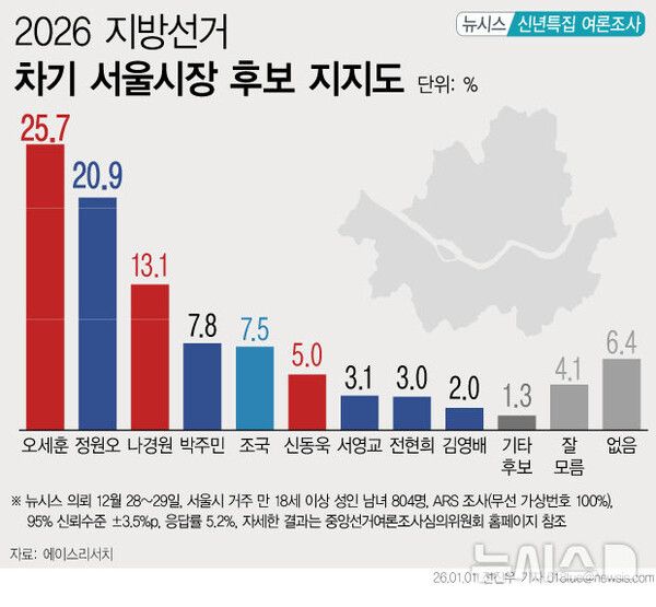 올해 6·3 지방선거 서울시장 후보 지지도 조사에서 국민의힘 오세훈 서울시장이 25.7%, 더불어민주당 정원오 구청장이 20.9%를 기록했다는 여론조사 결과가 1일 나왔다.