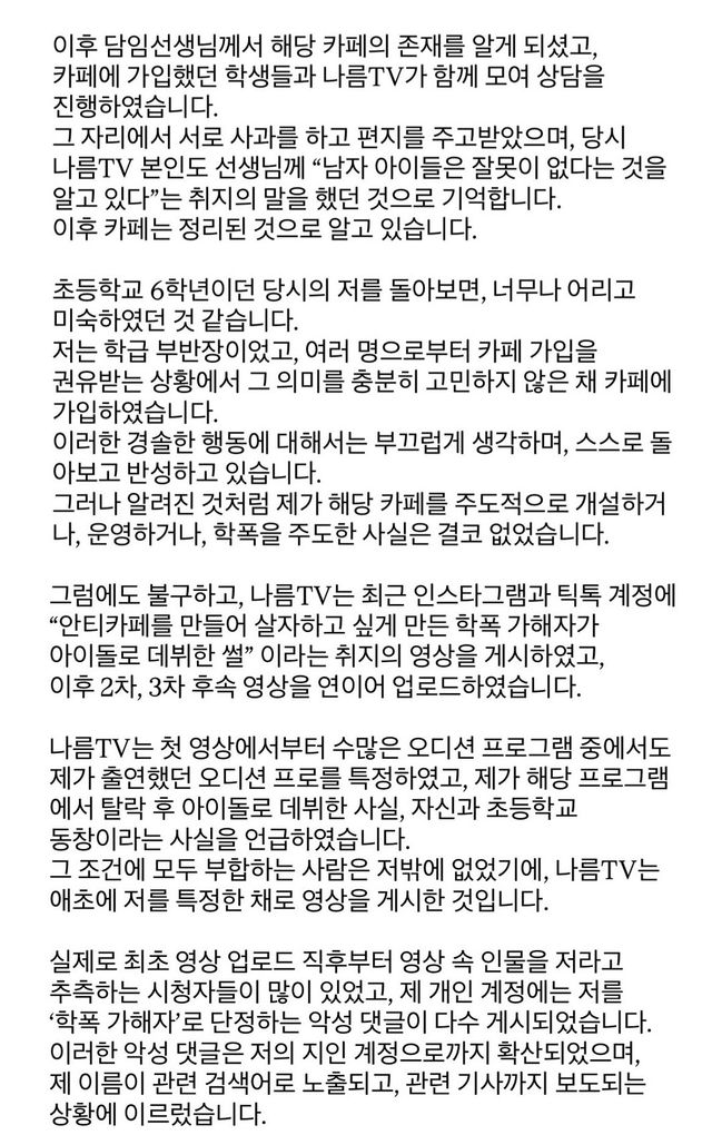 당시 담임의 중재 하에 카페 가입자들과 나름 TV가 서로 사과를 하고 편지를 주고받았다는 그는 "나름TV 본인도 선생님께 '남자 아이들은 잘못이 없다는 것을 알고 있다'는 취지의 말을 했던 것으로 기억한다"고도 전했다.