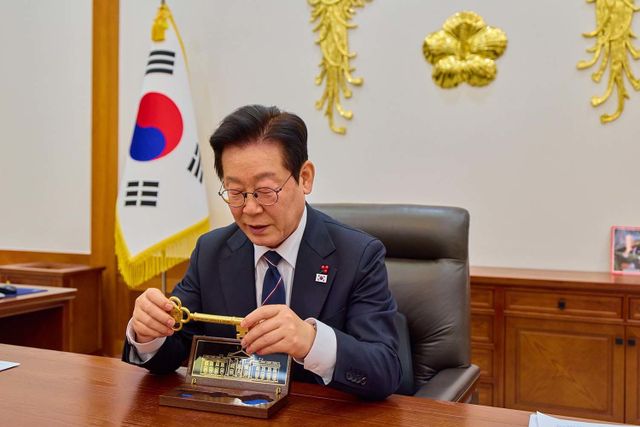 이재명 대통령이 2025년 12월 30일 청와대 집무실에서 도널드 트럼프 미국 대통령이 선물한 '백악관 황금 열쇠'를 살펴보고 있다. 황금열쇠는 트럼프 대통령이 '언제든 백악관을 방문할 수 있다'는 의미를 담아 가까운 인사에게 주는 특별한 선물이다. / 이재명 대통령 SNS.