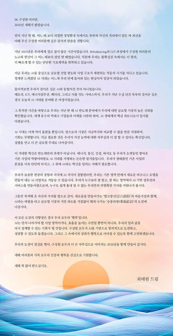 아울러 최 회장은 "구성원 모두가 AI를 기반으로 창의적으로 도전하고 성장할 수 있도록 지원하고, 그 안에서의 성취가 각자의 행복으로 이어질 수 있도록 고민하겠다"고 밝혔다. 그는 "우리의 도전이 결실을 맺어 구성원 모두의 더 큰 자부심으로 이어지는 2026년을 함께 만들어가자"고 말했다.