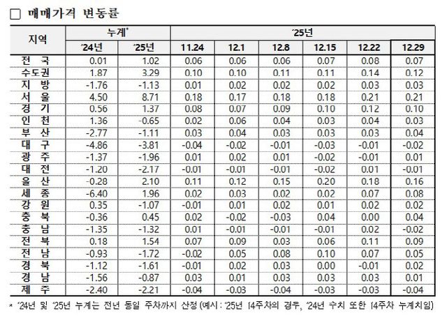 비수도권의 경우 12월 다섯째 주 0.03%가 올랐지만 그간 누적 하락폭이 더 커 지난해 연간으로는 1.13% 떨어졌다. 전국은 12월 다섯째 주 0.07%가 올라 지난해 누적 상승률은 1.02%를 기록했다. 5대 광역시를 살펴보면 부산이 12월 다섯째 주 0.11%가 올라 전주(0.09%) 대비 상승폭을 키웠고 울산은 0.15%로 전주(0.17%)보다 상승폭이 떨어졌지만 오름세를 유지했다.