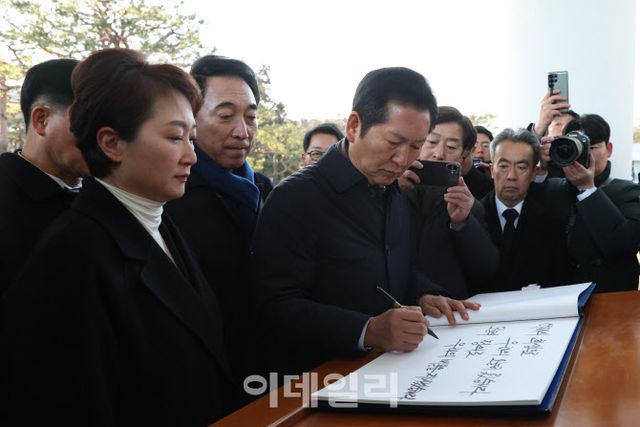 한편 정 대표는 이날 노 전 대통령 묘역을 참배한 후 방명록에 ‘노무현의 꿈을 이어가겠습니다’라고 적었다. 정 대표는 “2026년 병오년에는 노무현의 꿈, 이재명 정부 성공의 꿈, 지방선거 승리의 꿈을 이어가겠다”며 “노무현 대통령께서 그토록 바랐던 특권과 반칙이 없는 사회, 민주주의가 강물처럼 넘쳐흐르는 사회, 전쟁 없는 한반도 평화의 길, 풀뿌리 민주주의가 흔들리지 않고 착근하는 지방분권 국토 균형 발전의 꿈을 민주당이 이어가겠다”고 했다.