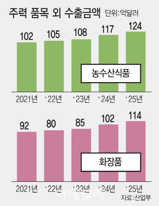 특히 전 세계에 K푸드·뷰티 선호가 확대되면서 소비재 수출이 두각을 나타냈다. 농수산식품·화장품·패션의류·생활유아용품·의약품 등 5대 유망 소비재 수출 추이를 살펴보면, 이들 품목의 수출액은 지난해 463억달러를 기록하며 전년보다 8.4% 증가했다. 이 가운데 농수산식품(124억달러)과 화장품(114억달러) 수출은 각각 역대 최대 실적을 기록했다. 미국과 유럽을 중심으로 한류 콘텐츠와 결합한 브랜드 인지도가 높아지며 수요가 급증했다는 분석이다.