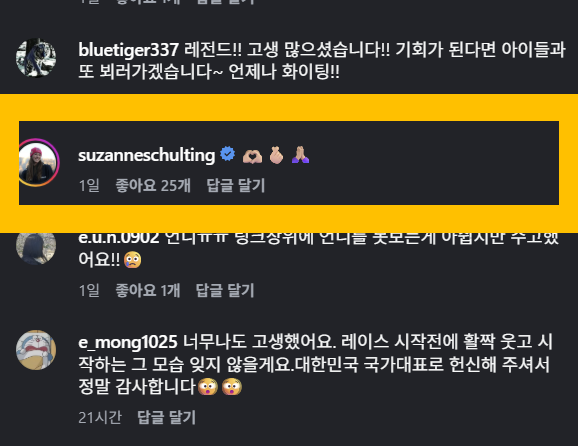 많은 이들이 그의 SNS에 격려와 축하의 댓글을 보낸 가운데 스휠팅의 이모티콘이 김아랑과 쇼트트랙 팬들의 시선을 모았다.