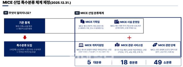 이번에 제정된 마이스 산업 특수분류엔 행사 준비부터 개최, 참가자 소비, 연관 서비스 등 산업 내 가치사슬에 있는 업종이 모두 포함됐다. 5개 대분류엔 기존 ‘기획·시설업’ 외에 기술·디자인·홍보 등 ‘개최지원업’, 숙박·수송·쇼핑 등 ‘관광 서비스업’, 협회·대학·교육기관 등 ‘관련 단체’가 새롭게 포함됐다. 대분류 아래엔 18개 중분류에 이어 49개 소분류로 업종을 세분화했다.