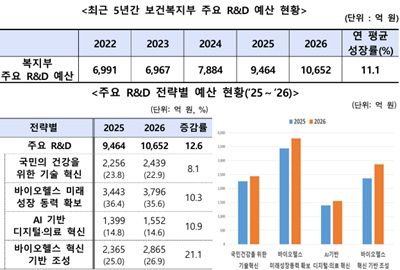 2026년 보건복지부 주요 R&D는 전년 대비 12.6% 증가한 1조 652억 원으로 총 83개 사업에 편성됐다.