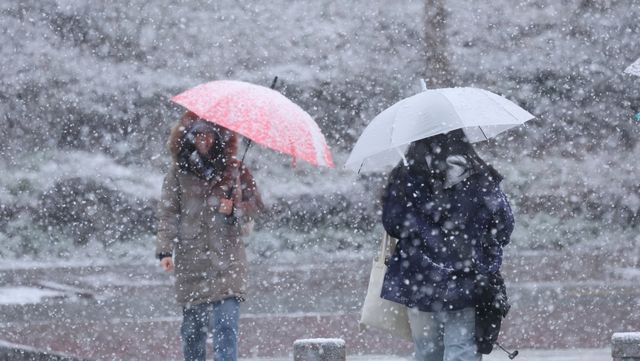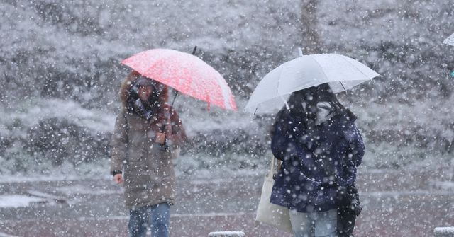 거리에서 시민들이 우산을 쓰고 눈길을 걷고 있다 / 뉴스1