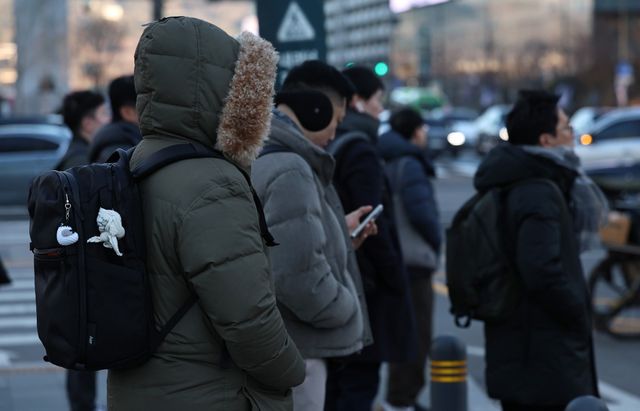 추위에 움츠린 시민들이 출근길 신호를 기다리고 있다. / 뉴스1