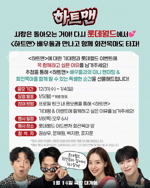 2026년 새해 극장가에 하하하하 웃음 가득한 에너지를 불어넣을 영화 ‘하트맨’이 개봉을 앞두고 예비 관객들과 함께하는 특별한 이벤트를 마련했다. 오는 1월 8일 오후 6시에 롯데월드 어드벤처 회전목마 앞에서 영화의 주역들과 함께하는 ‘사랑은 돌아오는 거야! 다시, 롯데월드에서’ 이벤트를 개최하는 것.