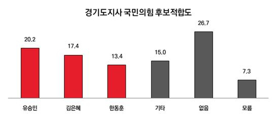 경기도지사 국민의힘 적합후보 질문에서는 유승민 전 의원이 20.2%로 1위를 기록했다. 뒤를 이어 김은혜 의원(17.4%), 한동훈 전 대표(13.4%) 순이었다. '적합인물 없음'은 26.7%, '모름'은 7.3%였다. 응답자의 30.6% 비율인 국민의힘 지지층에서는 김은혜 의원(36.2%), 한동훈(24.7%), 유승민(7.8%) 순으로 나타났다.