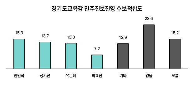 경기교육감 민주진보진영 적합후보 질문에서는 안민석 전 의원이 15.3%로 1위를 기록했다. 뒤를 이어 성기선 가톨릭대학교 교수(13.7%), 유은혜 전 교육부총리(13.0%), 박효진 경기교육연대 대표(7.2%) 순으로 나타났다. 민주당 지지층에서는 안민석(24.7%), 성기선(20.0%), 유은혜(15.5%), 박효진(10.5%) 순으로 나타났다.