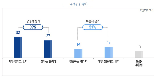 케이스탯리서치가 KBS의뢰로 지난달 29~31일 전국 만 18세 이상 남녀 1022명을 대상으로 이재명 대통령의 직무수행 평가를 조사한 결과 (무선100%, 전화면접, 95% 신뢰수준에 ±3.1% 포인트) '잘하고 있다'는 긍정평가는 59%, '잘못하고 있다'는 부정평가는 31%로 나타났다.