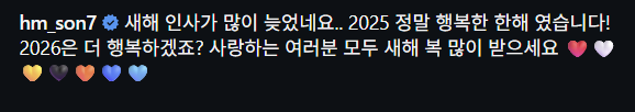 손흥민은 2일 자신의 SNS를 통해 "새해 인사가 많이 늦었네요.. 2025 정말 행복한 한해 였습니다! 2026은 더 행복하겠죠? 사랑하는 여러분 모두 새해 복 많이 받으세요"라고 인사를 올렸다.