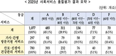보건복지부와 중앙사회서비스원이 12월 31일 가사·간병 방문지원 서비스와 산모·신생아 건강관리 서비스를 제공하는 1,077개 기관을 대상으로 실시한 ‘2025년 사회서비스 품질평가 결과’를 공개했다.