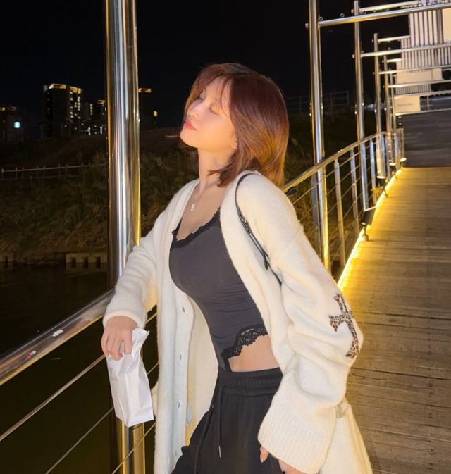 또 다른 사진에서는 은은한 조명이 이어진 다리 위에 서서 여유로운 포즈를 취했다. 도시의 불빛과 어우러진 밤 풍경 속에서 모모는 편안하면서도 스타일리시한 스트리트 룩을 완성하며 특유의 분위기를 자아냈다.