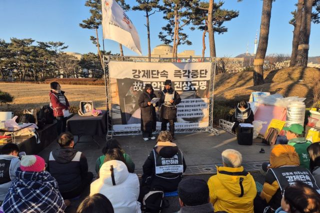농성장 한 켠에 놓인 뚜안 씨 영정은 딸이 추울까봐 아버지 부반숭 씨가 씌워놓은 목도리로 둘러싸여 있었다. 해단식 사회를 맡은 박희은 이주노동자차별철폐네트워크 집행위원은 부반숭 씨가 이날 아침부터 딸의 영정에 핫팩을 대고 서 있었다고도 했다.