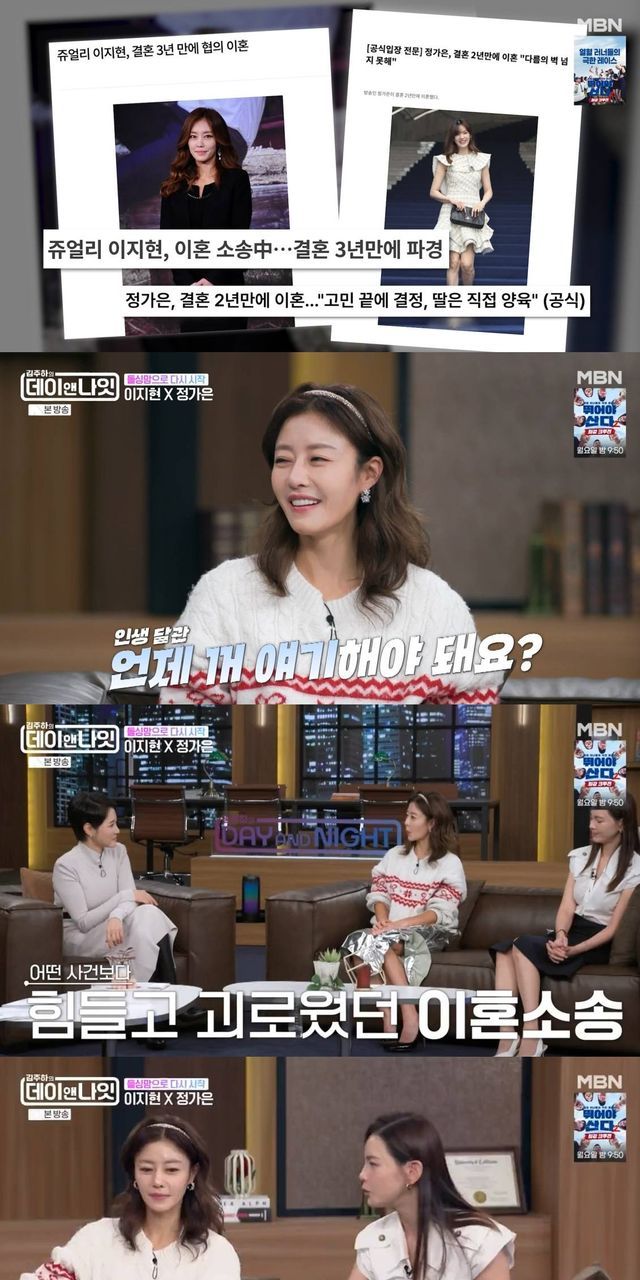 3일 방송된 MBN 예능 프로그램 ‘김주하의 데이앤나잇’에는 배우 정가은과 이지현이 출연해 김주하와 함께 ‘돌싱맘’들의 현실적인 토크를 나눴다.