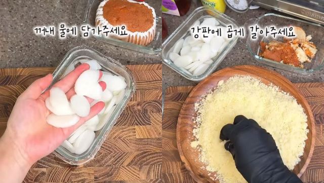 떡국 떡을 물에 담가놓은 모습(왼)과 카스테라 빵을 곱게 간 모습(오). / 유튜브 '홈쿡셰프'