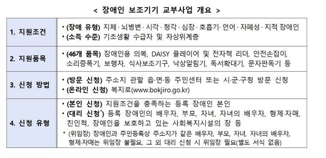 복지부는 보조기기 교부 사업으로 지원하는 보조기기의 품목 개수를 점차 확대해 올해 총 46개의 품목을 지원한다고 전했다. 1인당 연간 총 지원 금액 200만원 한도 내에서 최대 3개 품목까지 지원받을 수 있다. 장애인 본인이 직접 신청하기 어려울 경우에는 배우자, 부모, 자녀 등의 대리 신청도 가능하다.