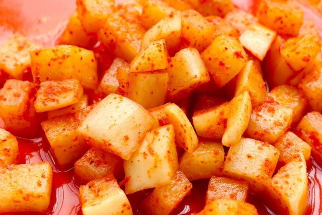 조리 순서는 간단하다. 절인 무의 물기를 뺀 뒤 고춧가루로 먼저 색을 입힌다. 그다음 멸치액젓, 마늘, 생강 등 기본 양념을 넣을 때 요구르트를 함께 붓고 버무리면 된다. 이때 요구르트가 양념들이 무에 잘 달라붙게 만드는 접착제 역할도 겸하기 때문에 양념이 겉돌지 않고 무에 골고루 배어든다.