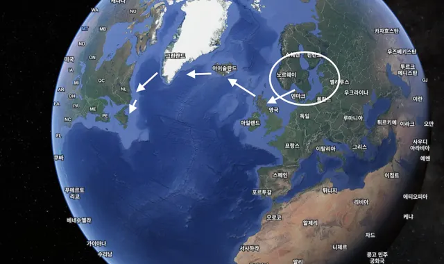 우리가 흔히 하는 세계지도만 봐서는 어떻게 작은 바이킹 배를 타고 대서양을 건너갔지 싶은데