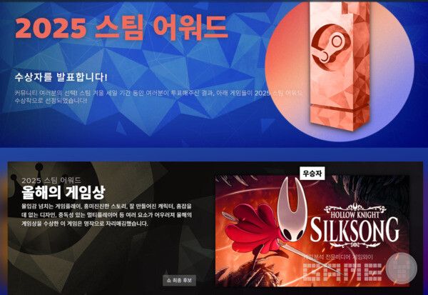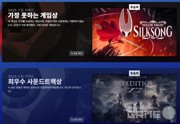 역대 3위 기록의 올해의 게임(GOTY) 수상 횟수를 자랑하는 클레어 옵스큐어: 익스페디션 33이 스팀 어워드 2025에서는 할로우 나이트: 실크송에 게임 오브 더 이어 상을 내줬다.