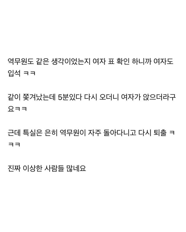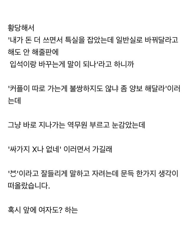 당황한 작성자가 상대방의 좌석 번호를 묻자, 이 커플은 놀랍게도 좌석이 없는 '입석' 상태인 것으로 드러났습니다. 정당한 비용을 지불하고 특실을 잡은 작성자가 거절하자, 이 커플은 "커플이 따로 가는 게 불쌍하지도 않냐", "좀 양보해달라"며 막무가내식 태도를 보였습니다. 심지어 작성자가 역무원을 불러 상황을 정리하려 하자 "싸가지 X나 없네"라며 적반하장격인 욕설까지 내뱉은 것으로 확인되었습니다. 결국 이 커플은 역무원에 의해 퇴출당했으나, 이후에도 다시 몰래 들어와 앉았다가 재차 쫓겨나는 추태를 부린 것으로 전해졌습니다.