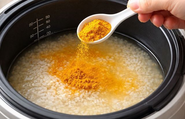 전기밥솥에서 밥을 지을 때 강황 가루를 넣어주는 모습. 기사 이해를 돕기 위해 AI를 활용해 제작한 자료 사진입니다.