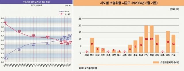 지방은 소멸 위기에 직면하고 있다. 한국고용정보원에 따르면 소멸위험지역은 2024년 3월 기준 228개 시군구 중 130곳(57%)으로 늘어났다. 지역별로는 전남과 경북이 각각 20곳으로 가장 많았고 △강원 16곳 △전북 13곳 △경남 13곳 △충남 12곳 △부산 11곳 △충북 9곳 △경기 6곳 △대구 4곳 △인천 3곳 △대전 2곳 △ 울산 1곳 등 순이었다.