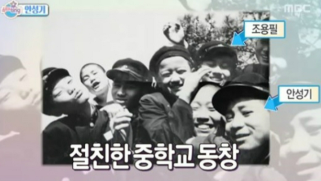 고인과 조용필의 인연은 중학교 시절로 거슬러 올라간다. 두 사람은 서울 경동중학교 동창으로, 같은 반에서 학창 시절을 보냈다. 안성기는 돈암동, 조용필은 정릉에 살며 어린 시절부터 자연스럽게 어울렸다. 중학교 2학년 시절 강화도로 소풍을 떠나 함께 찍은 흑백 사진이 과거 방송을 통해 공개되며, 두 사람의 깊은 우정을 상징적으로 보여주기도 했다.