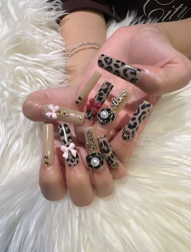 타이핑이나 생활에서 불편할 정도의 길이를 감수해야 비로소 갸루 네일이라 말할 수 있다. 한껏 과장된 기장의 스틸레토 혹은 스퀘어 연장 팁 위에 큼직한 파츠와 리본, 스톤을 마구 올릴수록 싱크로율이 비슷해질 것. 네일 전체 면적이 넓으니 레오퍼드나 글리터, 진주처럼 텍스처가 강한 것들도 돋보이고, 손 모양도 길게 예뻐 보이는 효과도 노릴 수 있다.
