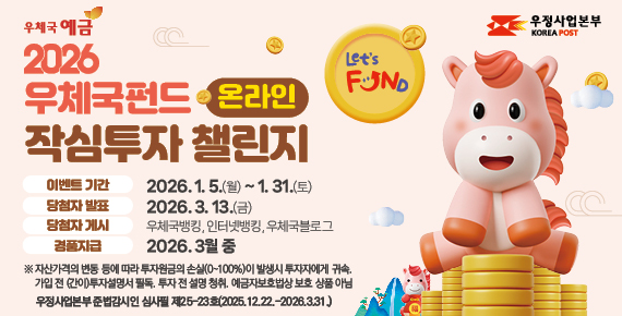 [프라임경제] 과학기술정보통신부 우정사업본부(이하 우본)는 오는 31일까지 우체국 펀드 온라인 가입 고객을 대상으로 '2026 우체국펀드 온라인 작심투자 챌린지' 이벤트를 연다고 5일 밝혔다.
