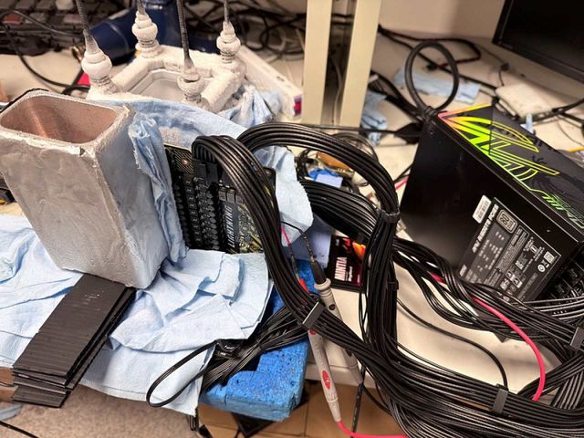 테스트용 임시 히트싱크를 사용. 600W 이상 TDP를 장시간 감당할 수 있는 구조는 아니지만, 어차피 LN2(액체질소) 환경에서 테스트가 이뤄지기 때문에 문제가 되지 않는다. 실제 오버클럭 환경에서는 공랭이나 수랭이 아닌 극저온 냉각이 사용된다.