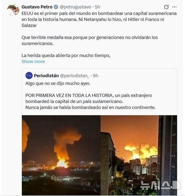 뉴시스 보도에 따르면, 페트로 대통령은 이날 사회관계망서비스 엑스(X·옛 트위터)에 올린 일련의 게시물에서 "미국은 인류 역사상 남미 수도를 폭격한 최초의 국가다. 친구는 친구를 폭격하지 않는다"며 이같이 밝혔다.