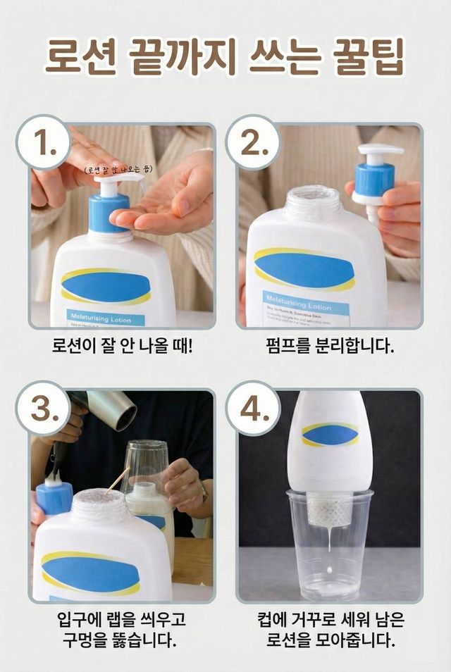 이 꿀팁을 직접 실행해 본다면, 펌프형 화장품을 끝까지 쓰는 데 거창한 도구는 필요 없다. 커피컵 하나만으로도 남은 내용물을 깔끔하게 모아 쓴다면 버려지는 양은 줄고 체감 효율은 크게 올라간다. 작은 생활 습관 하나가 낭비를 줄이는 방법이 된다.
