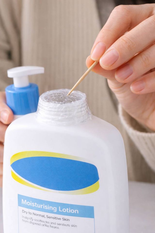 방법은 단순하다. 펌프 뚜껑을 열고, 그 위에 비닐 랩을 씌운다. 랩으로 고정이 잘 안 된다면 고무줄 같은 걸로 랩이 벗겨지지 않게 단단히 묶어 준다. 그런 뒤 이쑤시개나 바늘로 구멍을 톡 뚫어주기만 하면 된다. 이렇게 하면 비닐이 하나의 막을 만들어서 통 안에 남은 내용물을 입구 쪽으로 모이게 된다. 펌프질을 계속 해도 나오지 않던 로션이 드디어 세상 밖으로 나오게 된다.