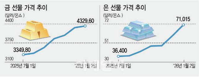 금은 이미 사상 최고치 수준에서 거래되고 있다. 지정학적 긴장 고조, 중앙은행의 대규모 매입, 미 연방준비제도(Fed·연준)의 추가 금리 인하 기대, 미국 부채 지속가능성 우려에 따른 달러 신뢰도 약화 등으로 2025년 한해 60% 이상 급등했다. 이 같은 금 가격 상승률은 1979년 이후 최고 기록이다. 지난해 연준의 3차례 연속 금리 인하도 이자를 지급하지 않는 귀금속 가격 상승을 뒷받침했다.
