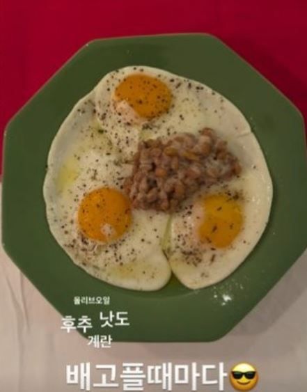 공개된 사진 속에는 감각적인 초록색 접시에 정성스럽게 플레이팅된 음식이 담겨 있어 눈길을 끈다. 완벽한 반숙으로 익혀진 계란 3알 위에 건강 식재료인 낫또가 가지런히 올라가 있으며, 그 위로 풍미를 더해줄 올리브오일과 후추가 곁들여진 모습이다.