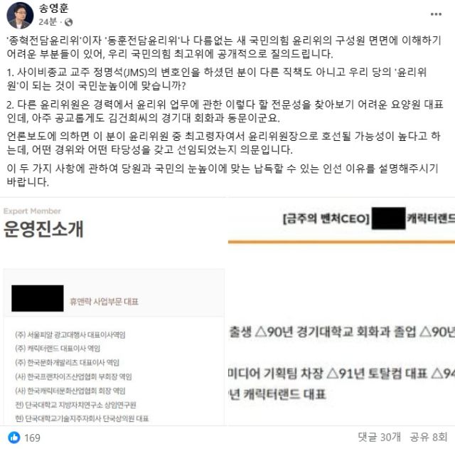 친한동훈계인 송영훈 전 국민의힘 대변인이 국민의힘 윤리위원회 구성에 대해 의문을 제기하고 나섰다. 윤리위원 명단은 공개되지 않았지만, 송 전 대변인은 일부 인사를 언급하며 이력에 의문을 제기했다.