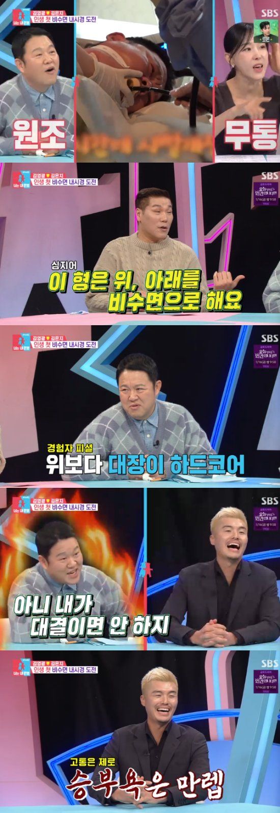 김영광은 비수면으로 위, 대장 내시경을 받기 시작했다. 김경훈은 "들어갈 때 구역질이 나올 수 있는데, 무통맨이면 그것도 참아야한다"고 장난쳤고, 김영광은 "막상 하려니 무섭다"고 했다.