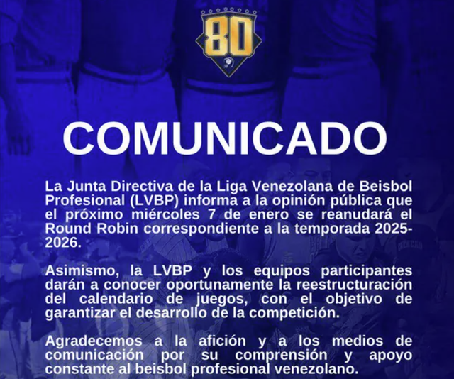 베네수엘라 야구 리그인 LVBP는 5일(한국시간) 성명서를 내고 "LVBP 이사회는 2025–2026시즌에 준결승 리그전을 오는 7일 재개한다고 대중에 알린다"며 "또한 LVBP와 참가 구단들은 대회의 원활한 진행을 보장하기 위해 경기 일정 재조정 내용을 적절한 시점에 공개할 예정이다"라고 밝혔다.