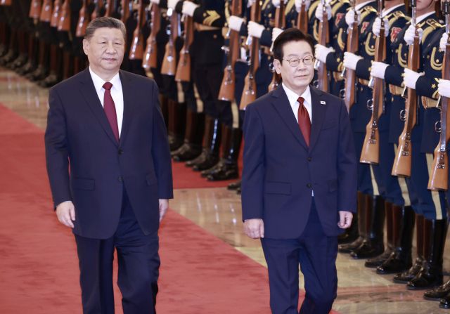 시 주석은 이날 중국을 국빈 방문한 이 대통령을 직접 맞이했다. 두 정상은 중국 베이징 인민대회당에 함께 입장하며 정상회담에 앞서 공식 환영식을 시작했다. 지난 11월 경주에서 나란히 푸른색 넥타이를 맸던 양 정상은 이날 회담에선 나란히 붉은색 넥타이 차림으로 참석했다.