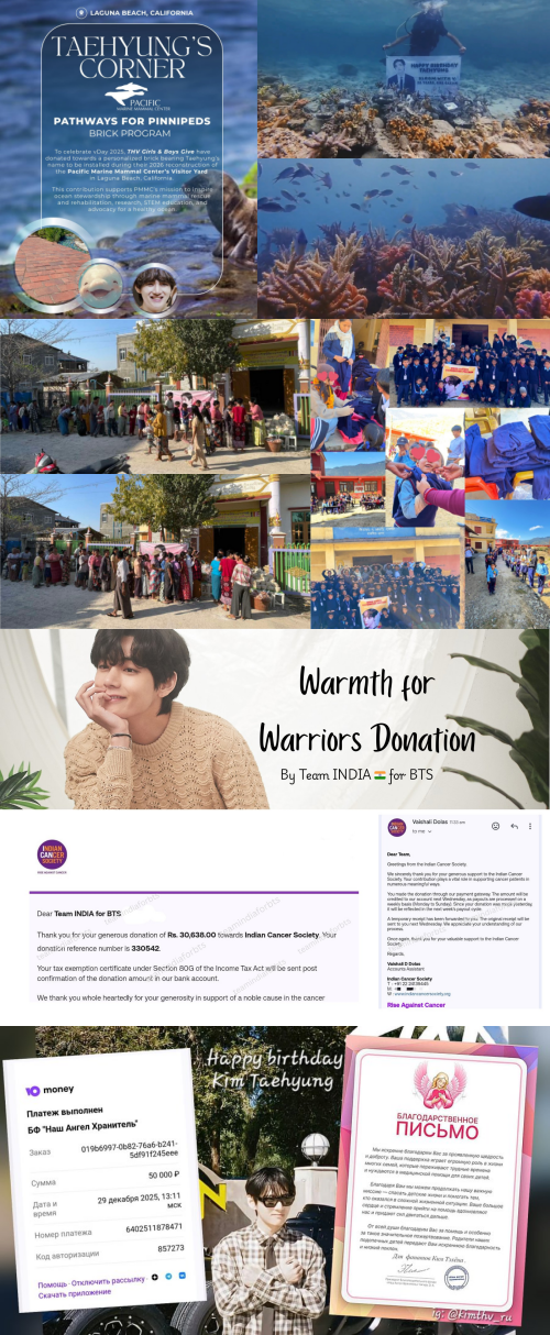 자연 보호를 향한 발걸음도 이어졌다. 미국 팬 ‘thvgirlsgive’은 캘리포니아 퍼시픽 해양 포유류 센터의 물개와 바다사자 구조 활동을 지원했고, ‘Taehyung Indonesia’는 자카르타 프라무카 섬의 산호초 식재 프로젝트에 참여했다. 팬 ‘VisMyWinterKing’ 역시 동물을 아끼는 뷔의 뜻에 공감해 동물보호협회(SPCA)에 기부했다고 전했다.