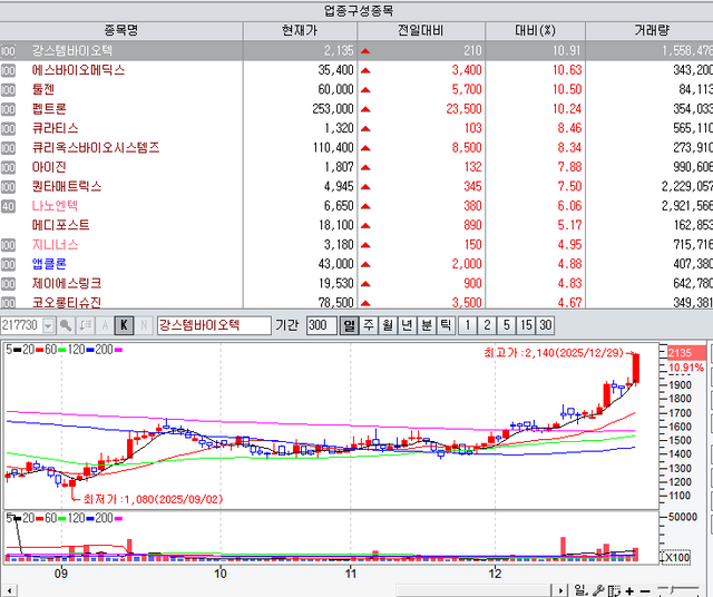 툴젠(199800)은 미국·유럽에서 CRISPR-Cas9 RNP 원천기술을 잇달아 인정받으며 주가가 급등했다. 강스템바이오텍(217730)은 모낭 오가노이드 기반 탈모 치료제 개발 이슈와 정책 기대감이 맞물리며 상승세를 탔다. 에이프릴바이오(397030)는 기술이전 자산이 글로벌 임상에서 존재감을 키우는 가운데 경쟁 약물의 잇단 이탈로 기술력이 재조명되며 주가가 강하게 올랐다.
