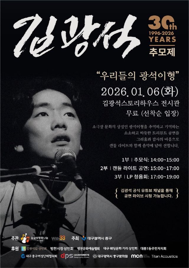 故 김광석 30주기 추모제가 오늘(6일) 대구에서 열린다. 대구 중구는 한국 대중음악사에 큰 발자취를 남긴 故 김광석의 30주기를 맞아 이날 오후 2시 중구 대봉동 ‘김광석스토리하우스’에서 추모제를 연다고 밝혔다. 평소 유료로 운영되는 김광석 스토리하우스는 이날 무료 개방하고, 유튜브 생중계를 병행해 시민들과 함께하는 비대면 추모의 장도 마련할 계획이다.