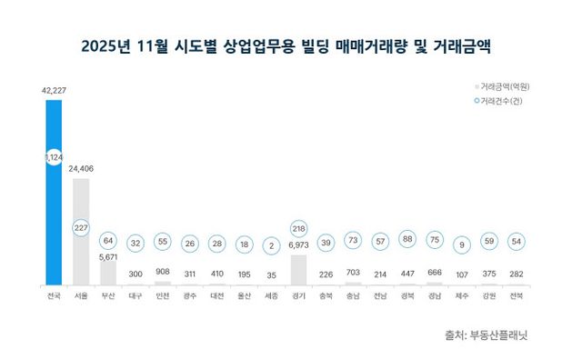 6일 부동산플래닛이 발표한 ‘2025년 11월 전국 상업업무용 빌딩 거래 시장 분석’ 빅데이터 리포트에 따르면 11월 전국 상업업무용 빌딩 거래량은 1124건으로 전월(1044건) 대비 7.7% 증가했고, 거래금액은 4조 2227억원으로 전월 대비 14.0% 늘었다. 다만 전년 동월과 비교하면 거래량은 2.5%, 거래금액은 14.0% 감소했다.