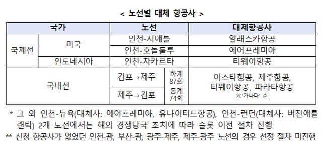 경쟁이 치열했던 인천-자카르타 노선은 티웨이항공이 최고 득점을 기록하며 대체 항공사로 낙점됐다. 단독 신청 노선인 인천~시애틀과 인천~호놀룰루 노선은 각각 알래스카항공과 에어프레미아를 대체항공사로 지정했다.