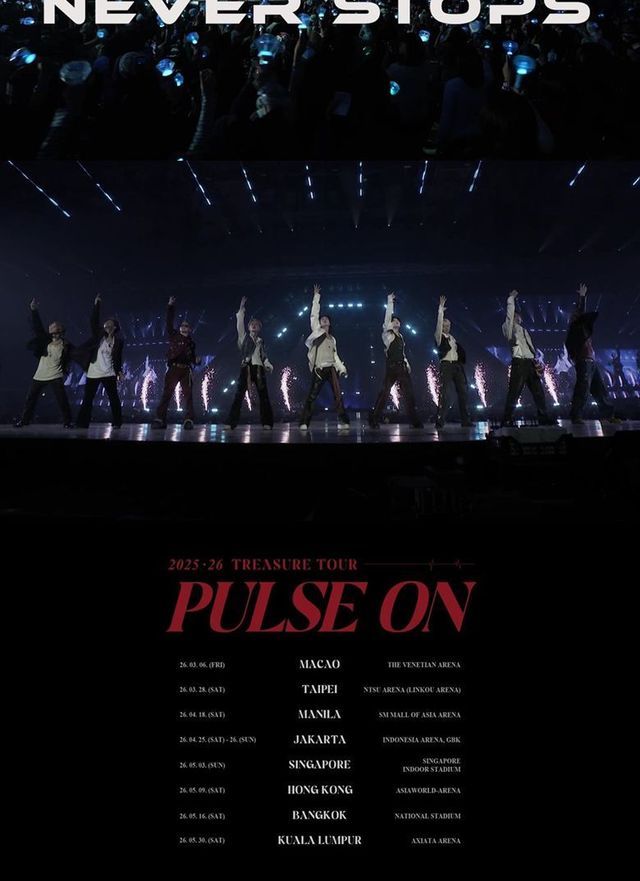 트레저는 14개 도시, 27회차에 달하는 ‘2025-26 TREASURE TOUR [PULSE ON]’을 전개하고 있다. 서울, 도쿄, 아이치, 후쿠오카, 카나가와 공연을 성황리에 마친 이들은 남은 일본 일정을 거쳐 마카오, 타이베이, 마닐라, 자카르타, 싱가포르, 홍콩, 방콕, 쿠알라룸푸르로 발걸음을 옮긴다.